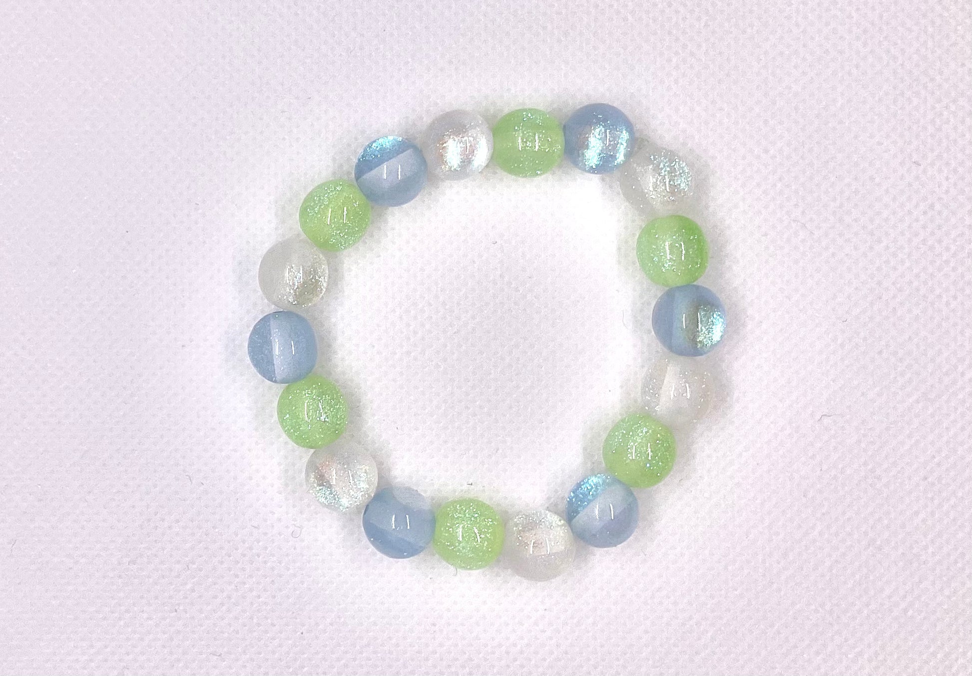 Please make sure to check the second image to help you choose a bracelet size. A bracelet mixed with the colors of white, green, and blue. These beads are Glittery glass beads, giving a shiny and glimmering look. Bead size is 10mm.